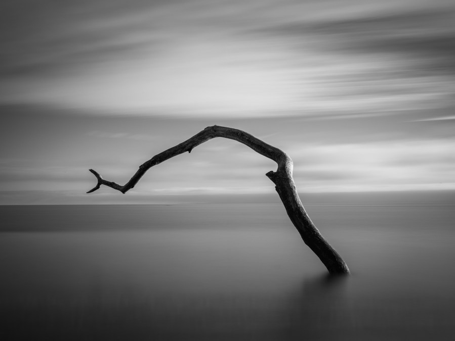 A note about this image: I was riding my bike along the shoreline, in search of possible images, equipped with my GFX50S II, a couple of GF lenses, a variety of filters and a tripod, when I noticed that this piece of driftwood was well positioned for a photo op. The branch had been in the bay for a few weeks, changing position with each tide cycle. On this afternoon, it was poking out of the water at an appealing angle, with great side light. The tide was going out, so I had limited time to make an image, before too much of the branch would be exposed. However, with the water receding, I could position the camera low enough to compose the photo with the end of the branch above the horizon. I used an infrared 720nm and an ND filter to increase the exposure to four minutes, which did a good job of smoothing the water.
